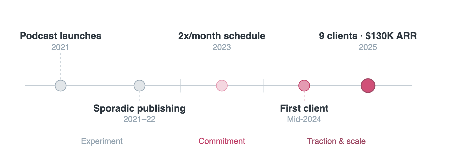 He was building an audience without building a funnel. People were listening. Some of them probably would have hired him. But there was no clear path from "I love this podcast" to "let me work with Jesse."